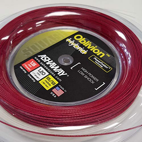 Die Ashaway Oblivion Hybrid-Saite bietet eine hervorragende Vibrations- und Geräuschreduzierung sowie zusätzliche Kraft und Stärke. Sie besteht aus zwei Saiten: Netz: Powernick 18 und Kreuzen: Powerfusion. Letzteres bietet ein außergewöhnliches Gefühl, Kraft und Haptik bei einer Stärke von 1,20 mm, während die PowerFusion eine 1,15 mm dicke Saite hat. Das Oblivion-Set wird in einer 110 m langen Spule geliefert, die für ca. 11 Besaitungsarbeiten ausreicht.